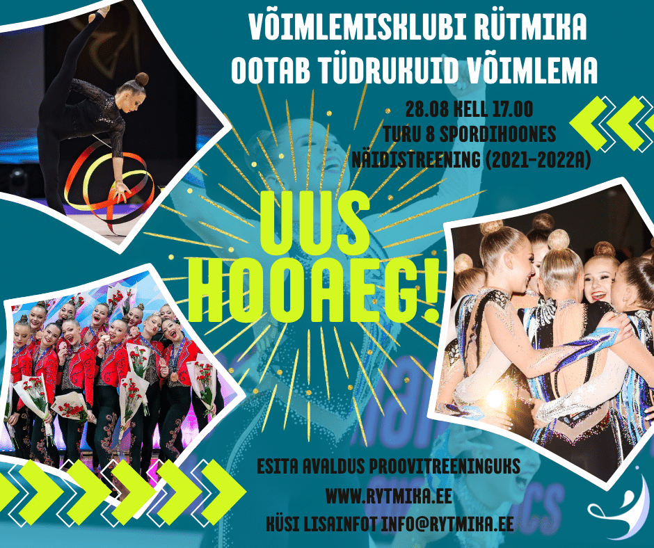 UUS HOOAEG! Juba peaaegu 35 aastat oleme kutsunud huvilisi Rütmikasse võimlema. Seekord ootame kõige nooremaid huvilisi (2021-2022 sünniaasta) näidistreeningule 28.augustil kell 17.00 Turu 8 spordihoones. Kõik teised huvilised suuname juba olemasolevate rühmade juurde TASUTA proovitreeningule. Esita avaldus juba TÄNA!